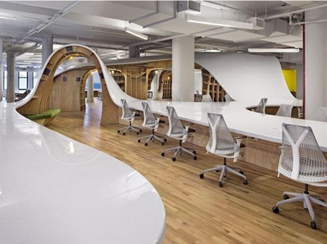 Bên trong văn phòng rộng 1.858 m2 này của tập đoàn Barbarian có một chiếc bàn dài tới 335m, đủ chỗ cho 175 nhân viên xuyên suốt các tầng. (Clive Wilkinson Architects; Design Republic Partners Architects LLP).