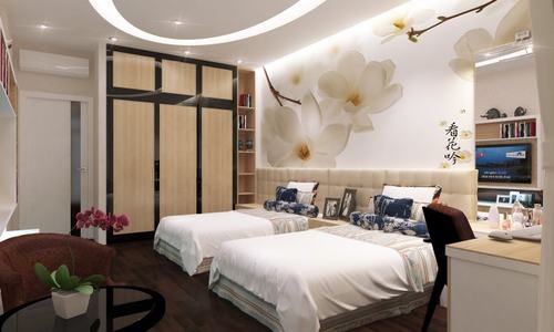 Phòng ngủ ông bà nội được thiết kế đơn giản mà tinh tế. Ánh sáng trắng vàng làm nổi bật không gian và những vật dụng kỷ niệm của ông bà. Mảng tường hoa trang trí là điểm nhấn chính tinh tế, gần gũi với thiên nhiên.