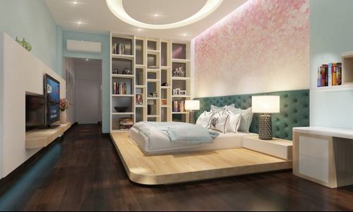 Phòng ngủ master với tông xanh và hồng ngọt ngào, đem đến cảm giác thư thái, bình an cho gia chủ. Giấy dán tường hoa văn phớt hồng trẻ trung, đồng thời là mảng nhấn giúp không gian thêm sinh động..jpg)