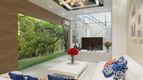 Phòng sinh hoạt chung là nơi gia đình nghỉ ngơi, thư giãn sau một ngày làm việc mệt mỏi. Mảng tường trang trí bằng tranh lớn trông như một góc khu vườn xanh mát mang đến cảm giác thư giãn, tĩnh tại. Gia chủ có thể bố trí thêm kệ, tranh treo đơn giản và ảnh kỷ niệm gia đình.