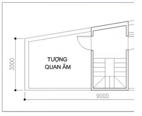Để không gian phần sau nhà không bị bí, chúng tôi đưa ra giải pháp tạo một giếng trời ở cuối khu đất tại vị trí bị vát chéo của mảnh đất. Thiết kế này sẽ giúp cho phòng ngủ được vuông vắn đồng thời cung cấp cung ánh sáng và thông gió cho nhà vệ sinh. Tầng tum, phía mặt tiền nhà là khu vực dựng tượng quan âm, phía sau là sân phơi.
