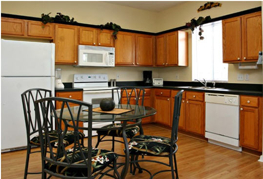 Căn bếp gọn gàng với nội thất gỗ.