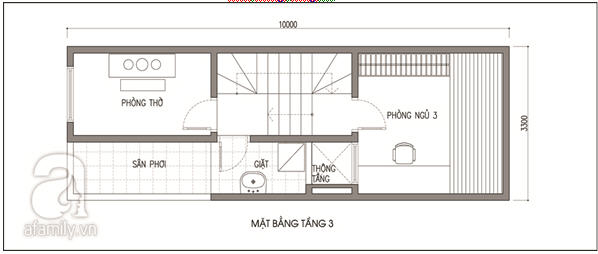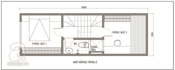 Tại tầng 2 và 3, cầu thang sẽ được thu hẹp đến mức tối thiểu để ưu tiên diện tích cho phòng ngủ. Giải pháp đưa ra là kết hợp thang và hành lang làm một. Hệ cầu thang bố trí lệch sẽ giúp 2 phòng ngủ như rộng và riêng tư hơn.