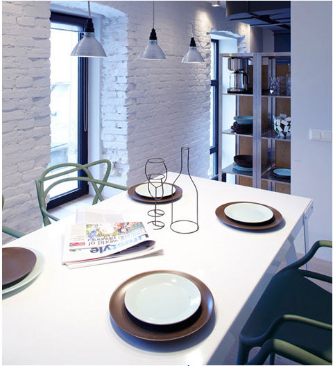 Bàn ăn với đèn thả và màu sắc trẻ trung hiện đại.