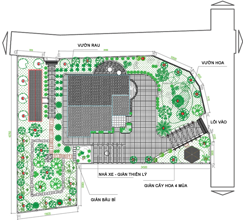 Nhà nên nằm giữa khu đất để tách biệt với các đường đi bên ngoài nhờ các mảng vườn. Garage ngoài trời, giàn che trồng thiên lý, bầu, bí, mướp hương... Vườn rau xanh nằm ở phần hiên sau. Các khoảng sân nên đổ khuôn bê tông đục lỗ hoặc bê tông xếp có khe hở, để cỏ mọc lên sẽ cắt tỉa, tạo vẻ đẹp tự nhiên.