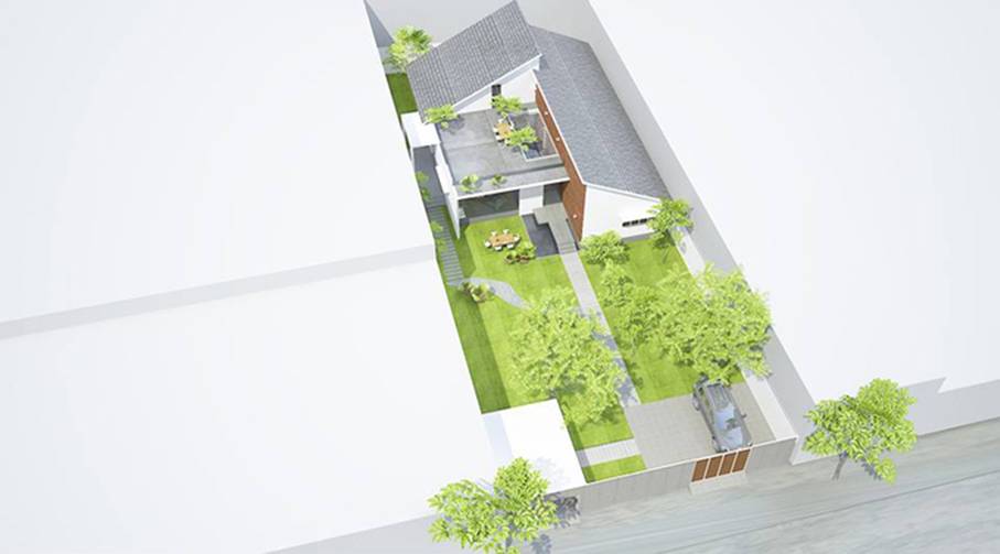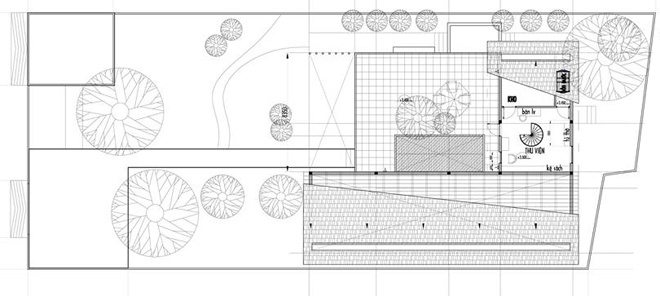 Khu nhà một tầng và một gác mái nhỏ được bố trí lùi sát về phía sau, tách biệt hoàn toàn với con đường ồn ào phía trước. Mặt bằng xây dựng là 250 m2, sân vườn là 470 m2. Lối dẫn ra vườn sau nhà cũng có những giàn quả, giò hoa lan trang trí.
