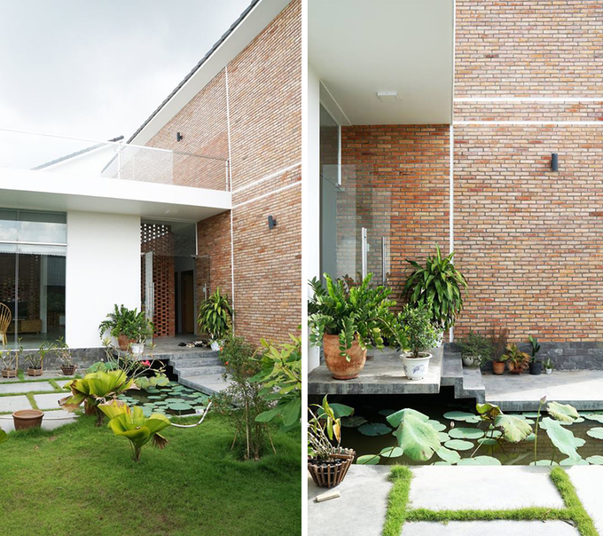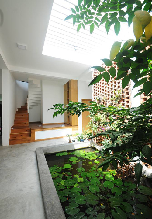 Màu xanh của thiên nhiên được dẫn tiếp từ ngoài vườn theo lối đi vào tới tận trong nhà. Ngay ở bậc thềm là một hồ sen, súng và những bình cây trang trí xinh xắn.