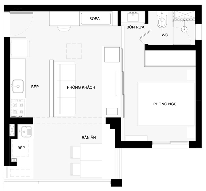 Phía sau cánh cửa đó là phòng ngủ, WC, hệ tủ đồ và bồn rửa để phía ngoài. Khu vệ sinh có một ô cửa sổ nhỏ giúp thông thoáng hơn.