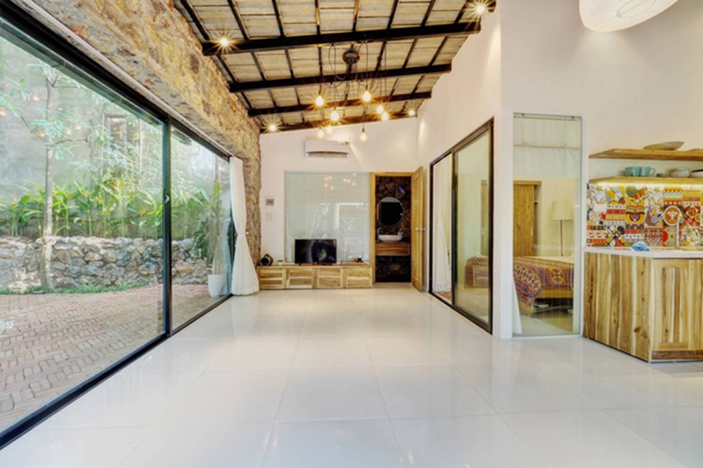 Nhà rộng hơn 30 m2 với phòng khách, bếp, một phòng ngủ, nhà tắm. Sofa có thể biến thành giường nằm khi có nhu cầu.
