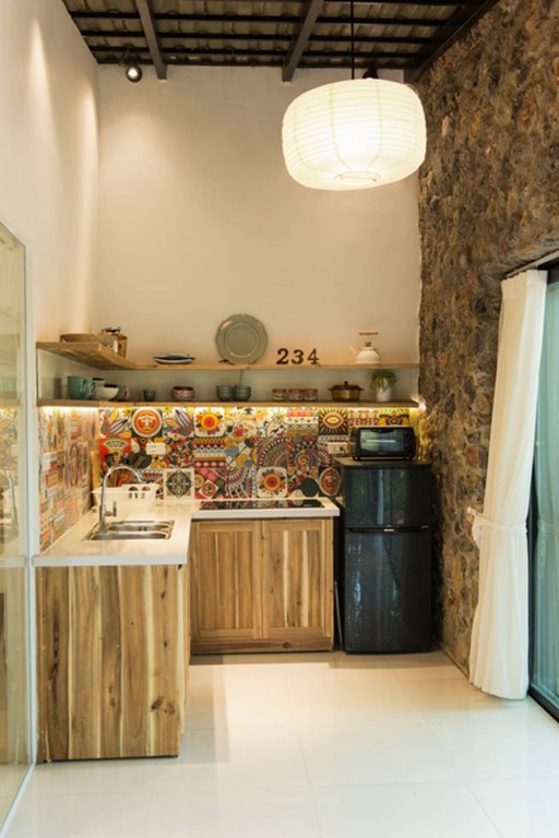 Người thiết kế gom những viên gạch men ốp tường nhiều màu sắc để đem lại nét tươi vui cho khu bếp.