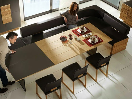 Nếu như diện tích căn hộ của bạn không đủ để tách riêng phòng ăn và phòng khách thì có thể kết nối 2 không gian này với nhau bằng một chiếc bàn mở rộng. Chiếc bàn này vừa đáp ứng yêu cầu đón khách ở phòng khách, vừa là bàn ăn tiện dụng cho cả gia đình hay những buổi tiệc đông người.