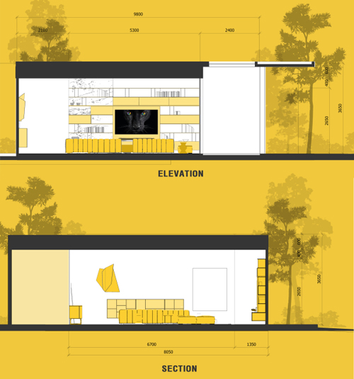 Phối hợp nhịp nhàng với màu sắc chính là đường nét thanh gọn của tủ kệ. Từ mẫu bàn console đến kệ treo trang trí, cánh tủ được thiết kế đóng mở ngẫu hứng nhưng vẫn tuân theo một ngôn ngữ nhất quán là sự vuông vức và sắc cạnh.