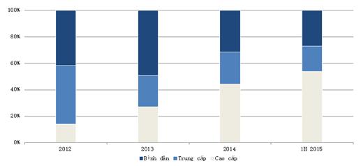 Lượng tiêu thụ căn hộ quý 2/2015 đánh dấu một kỷ lục mới trong lịch sử tiêu thụ hàng quý với trên 10.000 căn đã được giao dịch (bao gồm cả dự án mới và đã chào bán trước đó). Trong số liệu được công bố, tỷ lệ các giao dịch mua bán thành công trong giai đoạn 2012-2013 chủ yếu từ phân khúc bình dân thì trong thời gian gần đây đã chuyển dịch sang phân khúc cao cấp.