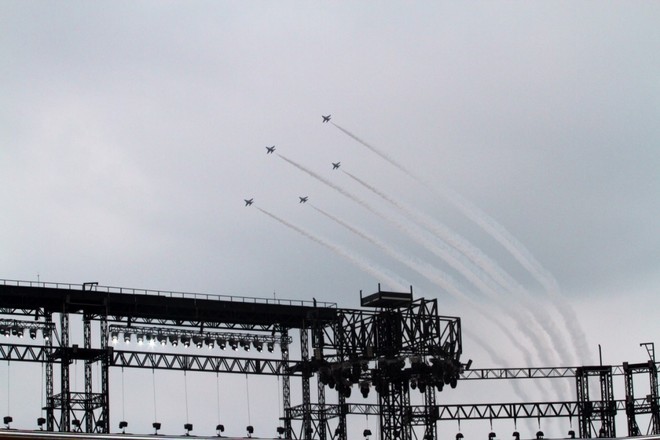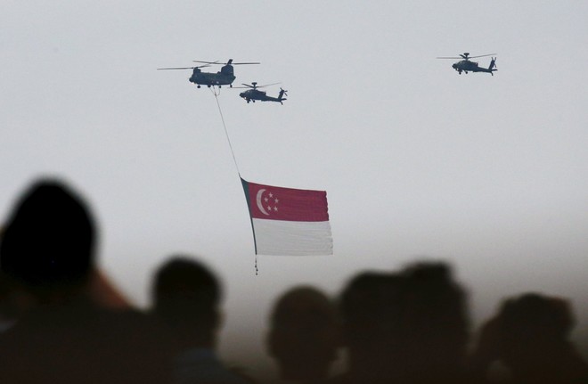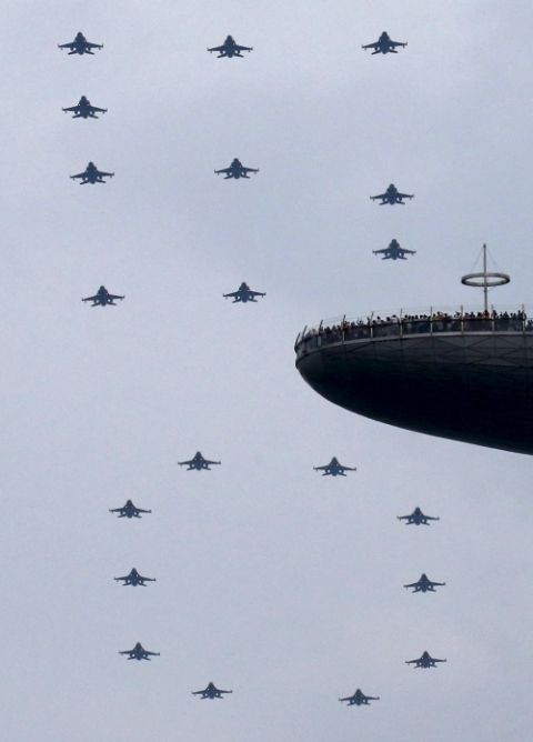 Không quân Singapore dàn đội hình, bay qua khách sạn Marina Bay Sands. Singapore trở thành nước độc lập sau khi tách khỏi Liên bang Malaysia năm 1965. Trong vòng 50 năm, nước này biến chuyển và trở thành một trong những nước giàu nhất thế giới.