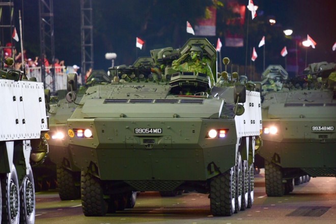 Binh sĩ và thiết bị quân sự Singapore trong lễ diễu hành. Ảnh: CNA