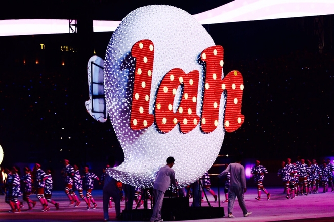 Một từ tiếng Anh đặc trưng của Singapore làm đạo cụ trong màn trình diễn. "Lah" được coi là một từ lóng, dùng ở cuối câu trong các cuộc hội thoại thường ngày của người Singapore. Ảnh: CNA