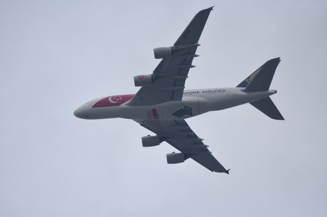 Máy bay Airbus A380 của Singapore Airlines trong màu quốc kỳ thể hiện bước phát triển của nước này trong vòng 50 năm qua. Đây là lần đầu tiên một máy bay thương mại tham gia buổi lễ diễu hành Quốc khánh. Tổng cộng 50 máy bay trình diễn trên không.