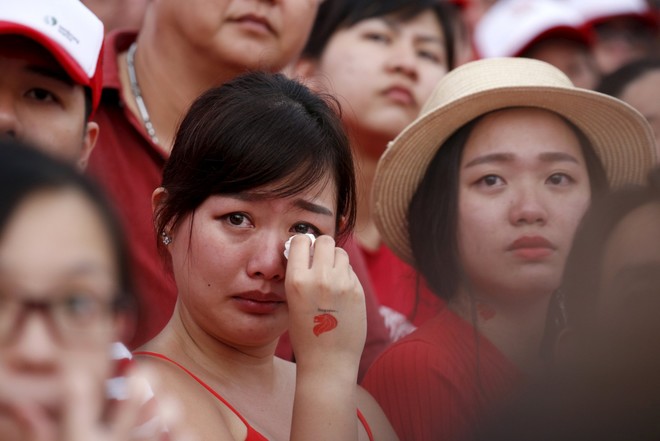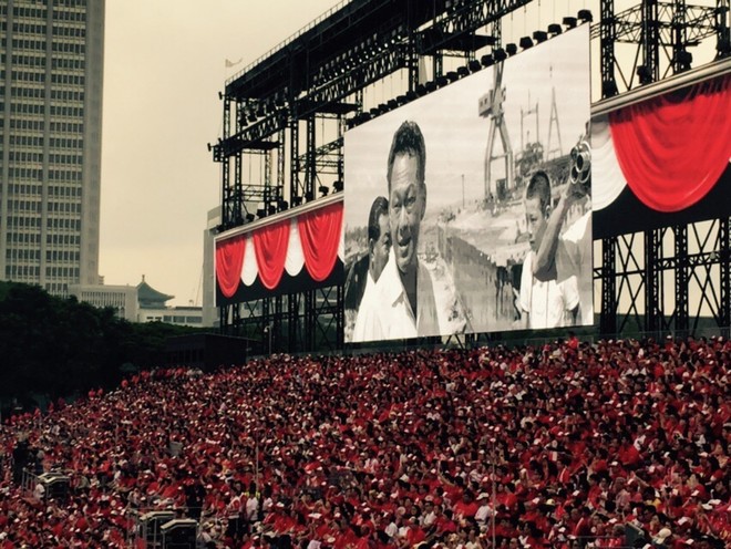Tại khu quần hợp Padang, nơi sự kiện chính diễn ra mừng lễ sinh nhật vàng, người dân xúc động khi xem đoạn video tưởng nhớ cựu thủ tướng Lý Quang Diệu, người qua đời hồi tháng ba.