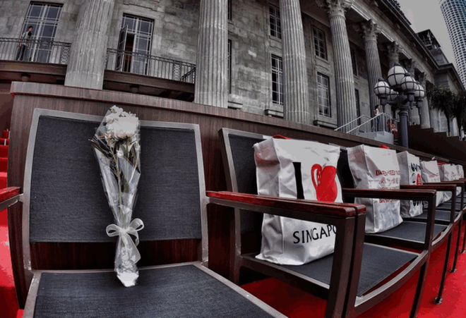Ghế dành cho ông Lý Quang Diệu tại Padang được bỏ trống và đặt hoa bên trên trước khi buổi lễ diễn ra. Ảnh: CNA